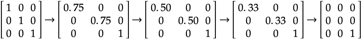 With this information, consider the original (buggy) code snippet (which animates the UIView.transform property). At face value, it is easy to assume that the iOS animation will just interpolate the identity matrix [[1,0,0], [0,1,0], [0,0,1]] (initialTransform) to [[0,0,0], [0,0,0], [0,0,1]] (scaleTransform) by interpolating each value of the matrix. Something like: